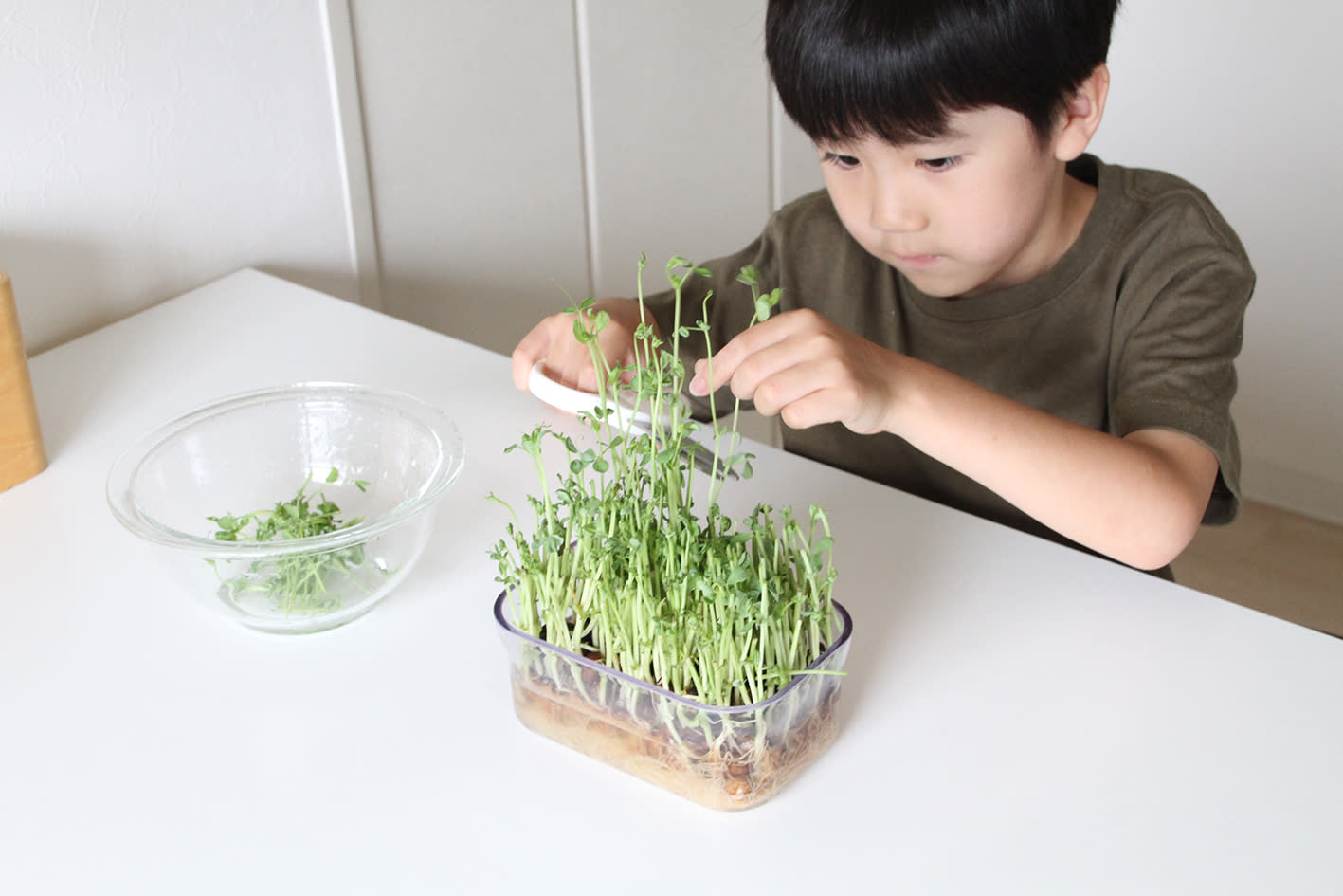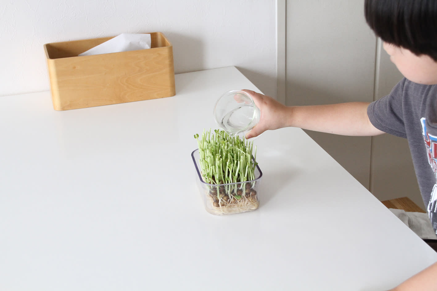 - タッパーや容器などに水をはり、切った野菜を入れるだけでOK。身近な材料だけでできるので、とても気軽に楽しめるアクションです。毎日どんな風に育っているかを子どもと一緒に観察してみましょう。