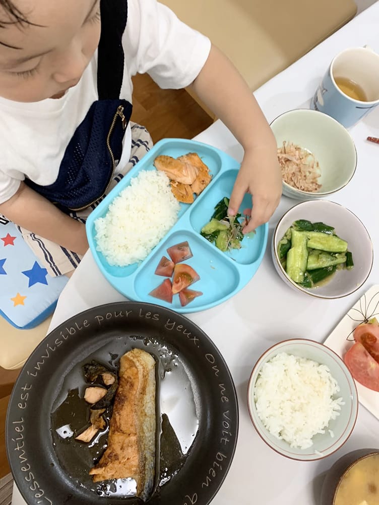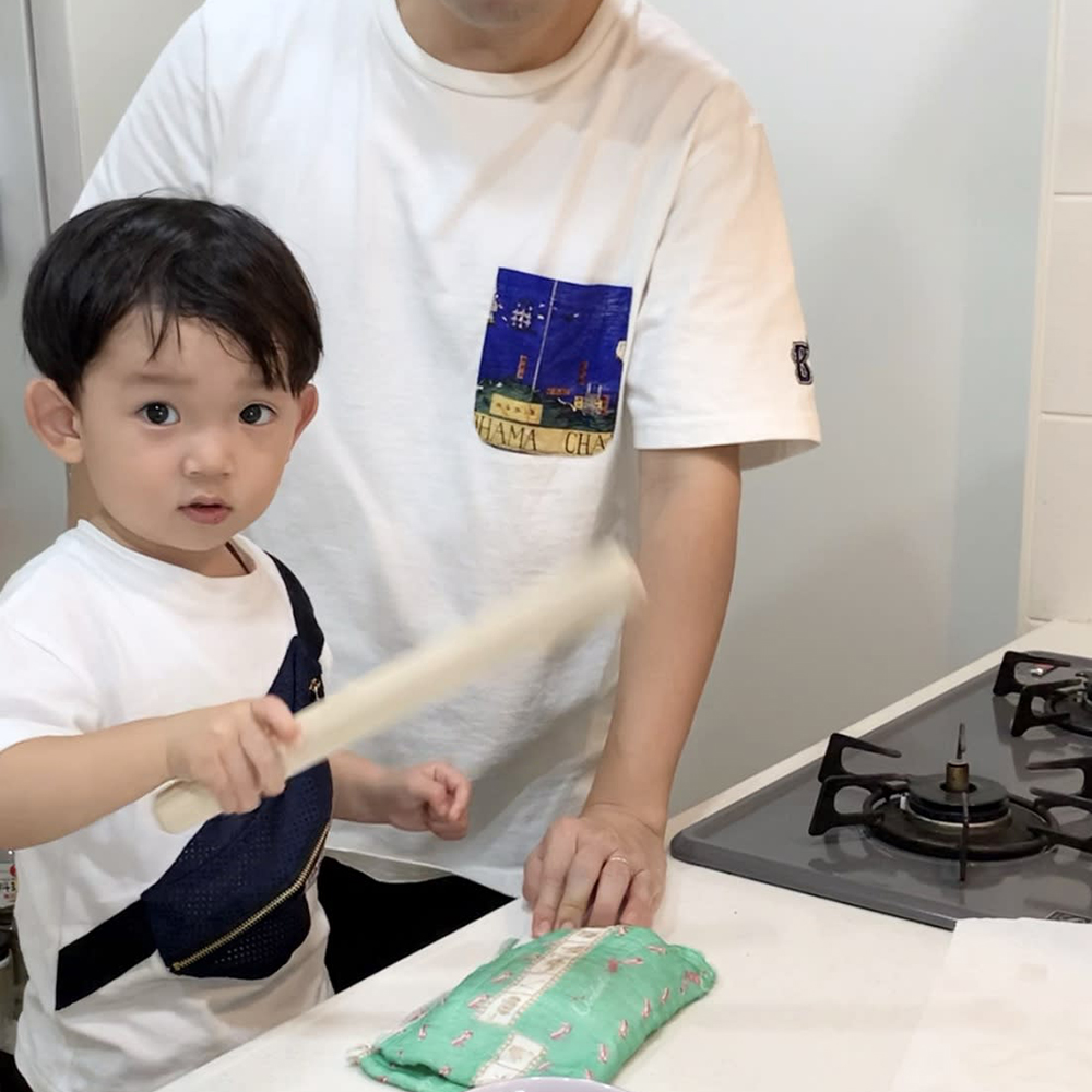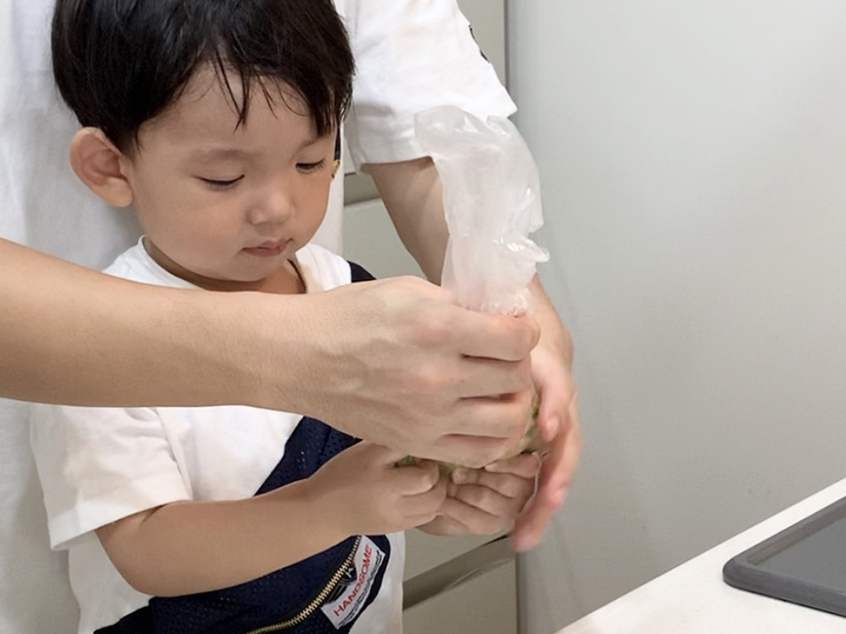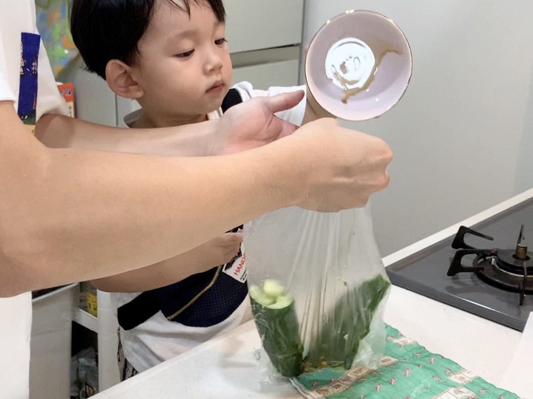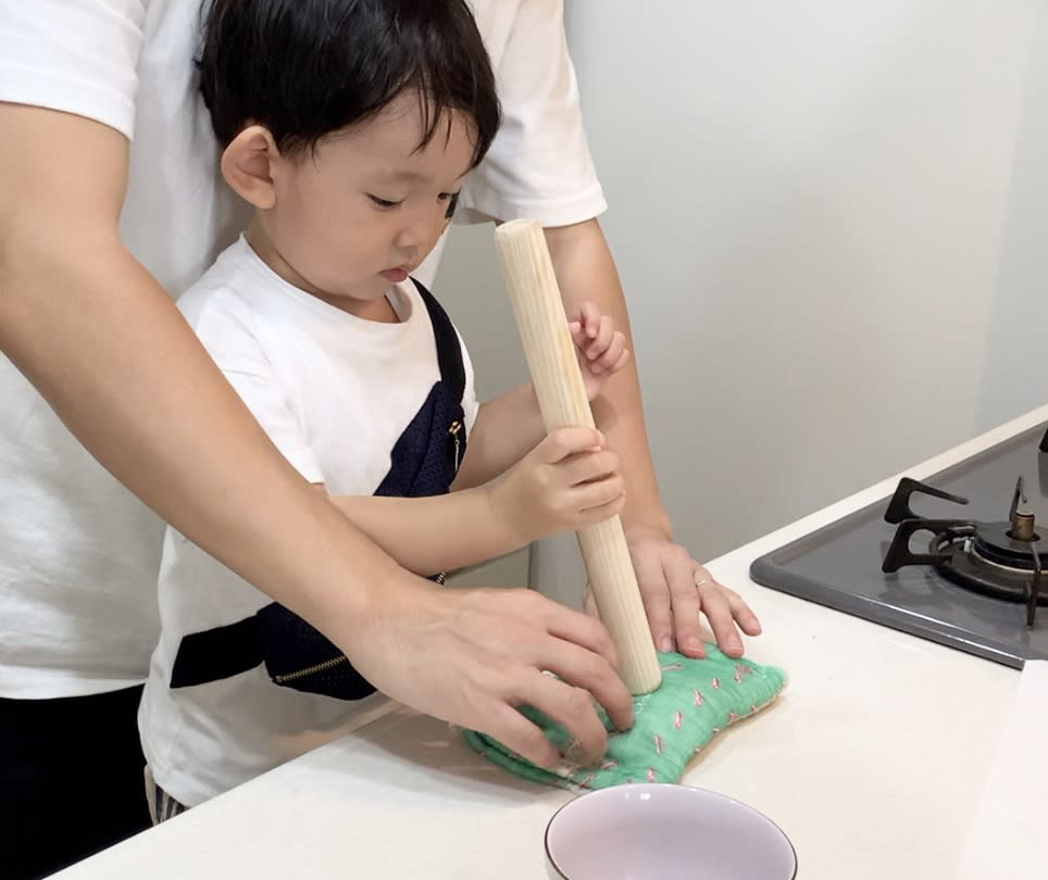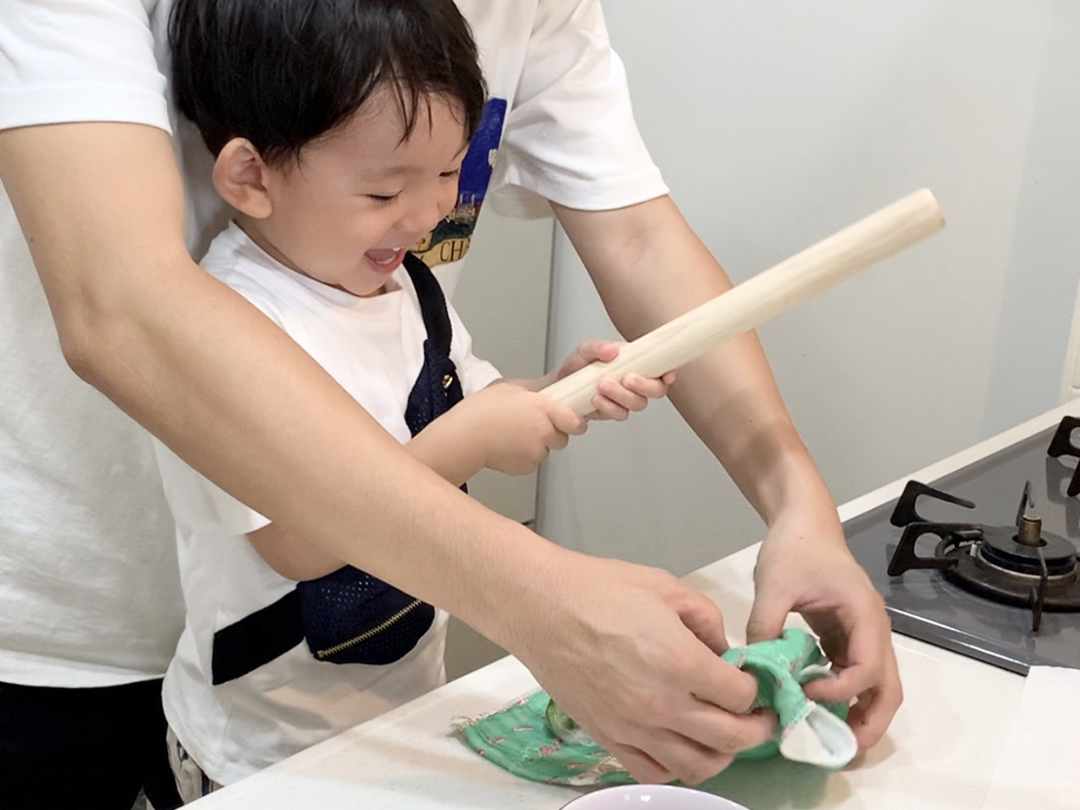 - たたくというのは、2歳くらいからできるお手伝いです。たたくことで、断面がぎざぎざになって味がからみやすくなります。