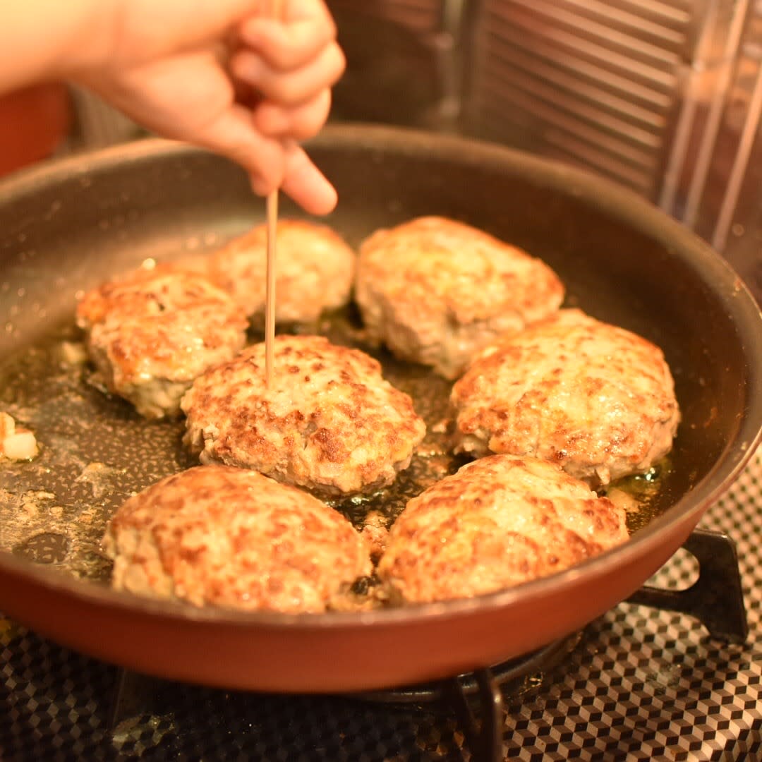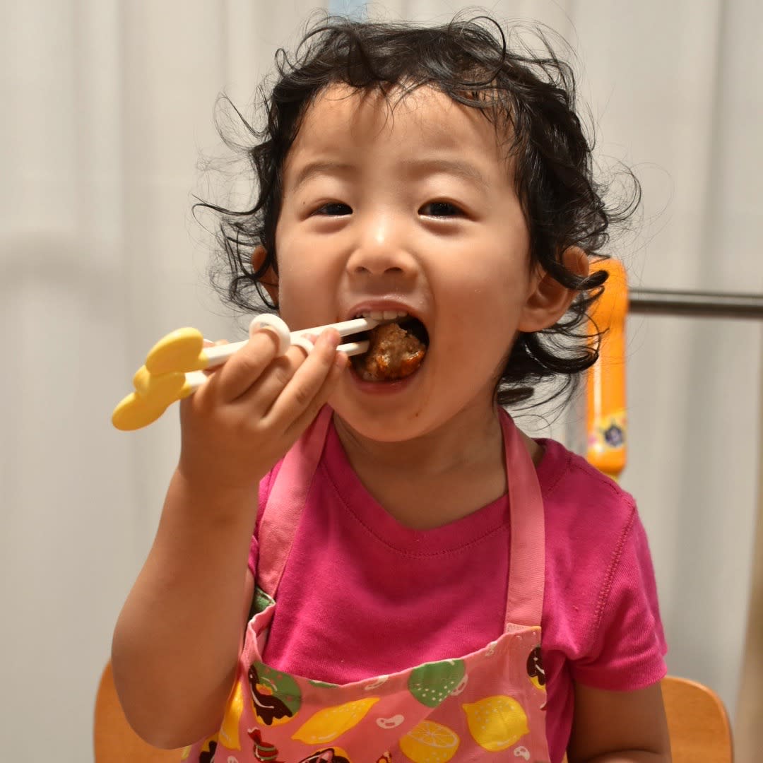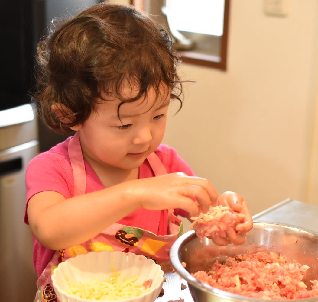 - ハンバーグをこねる、成形する、などの作業は子どもが大好き。少々汚してもいいので自由にさせてみましょう。