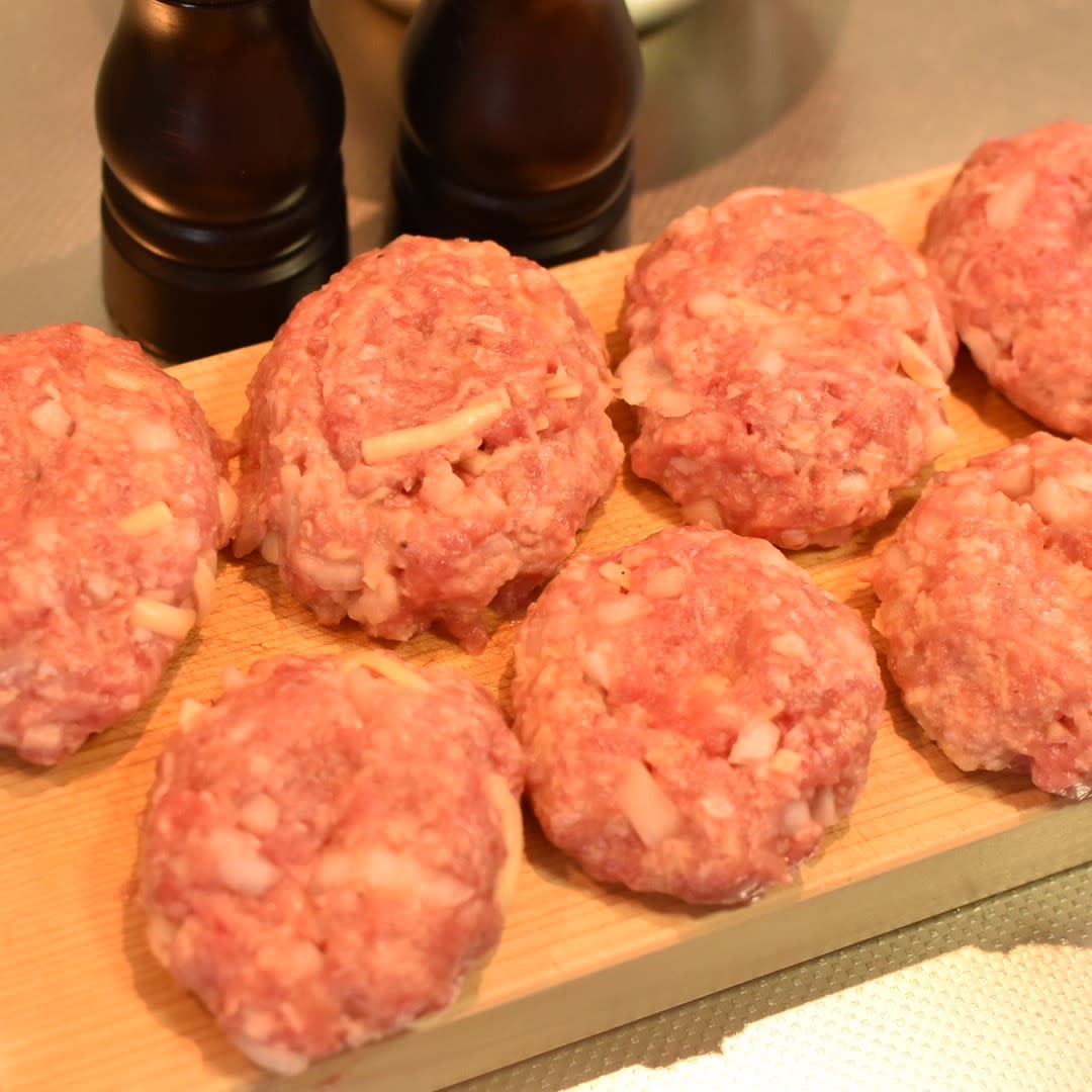 - ハンバーグのタネを並べるのに、まな板の上にラップを敷いておくと便利です。