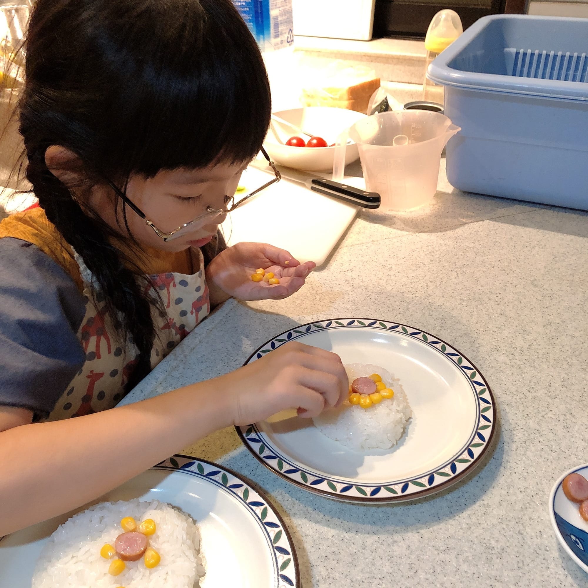 (3)ごはんをラップにくるみ丸く平たく形を整えてお皿にのせる。輪切りにしたソーセージを2つのせ、まわりに花びらのようにとうもろこしを並べる。茎と葉のように切ったきゅうりを置き、(2)のカレーをまわりに流しいれて出来上がり。