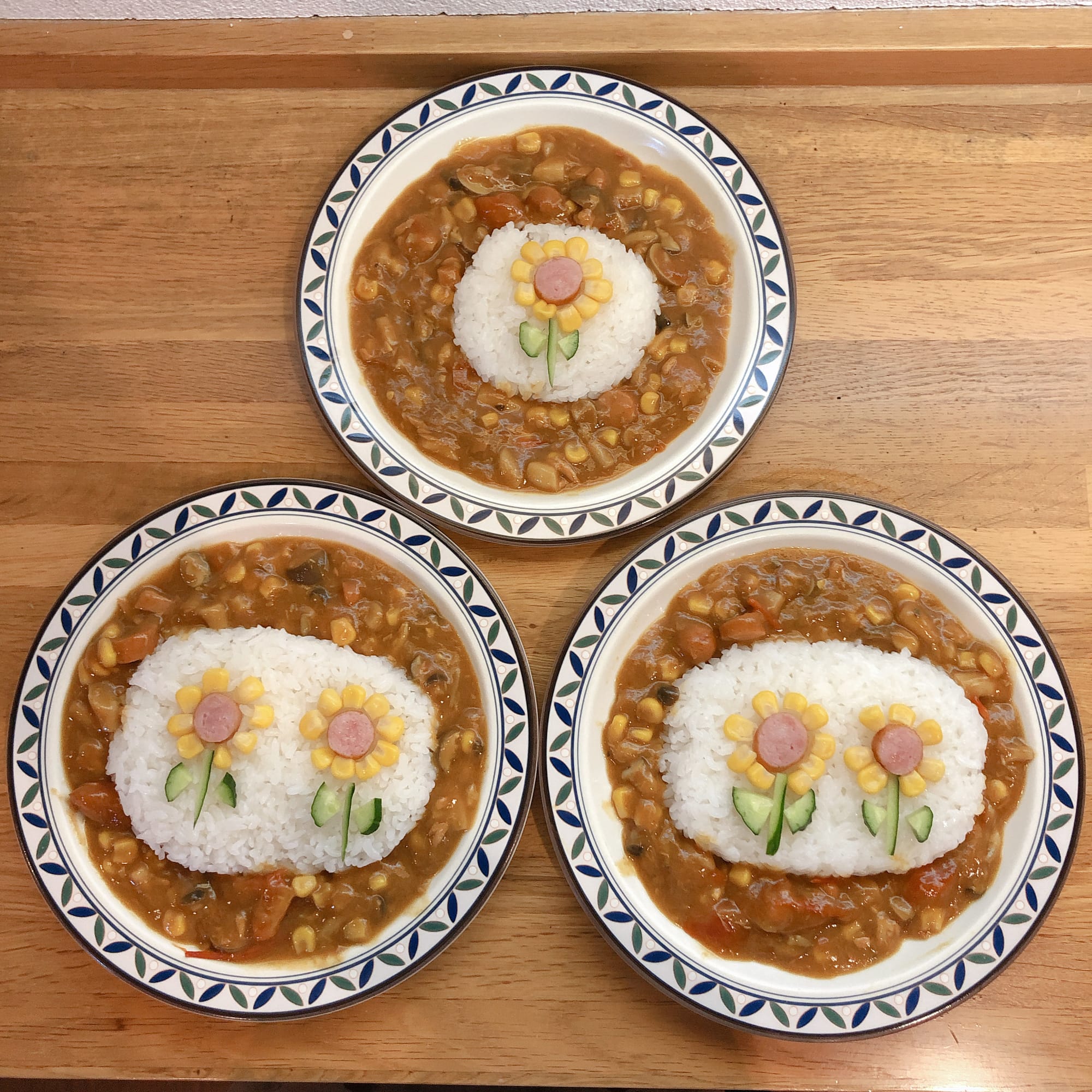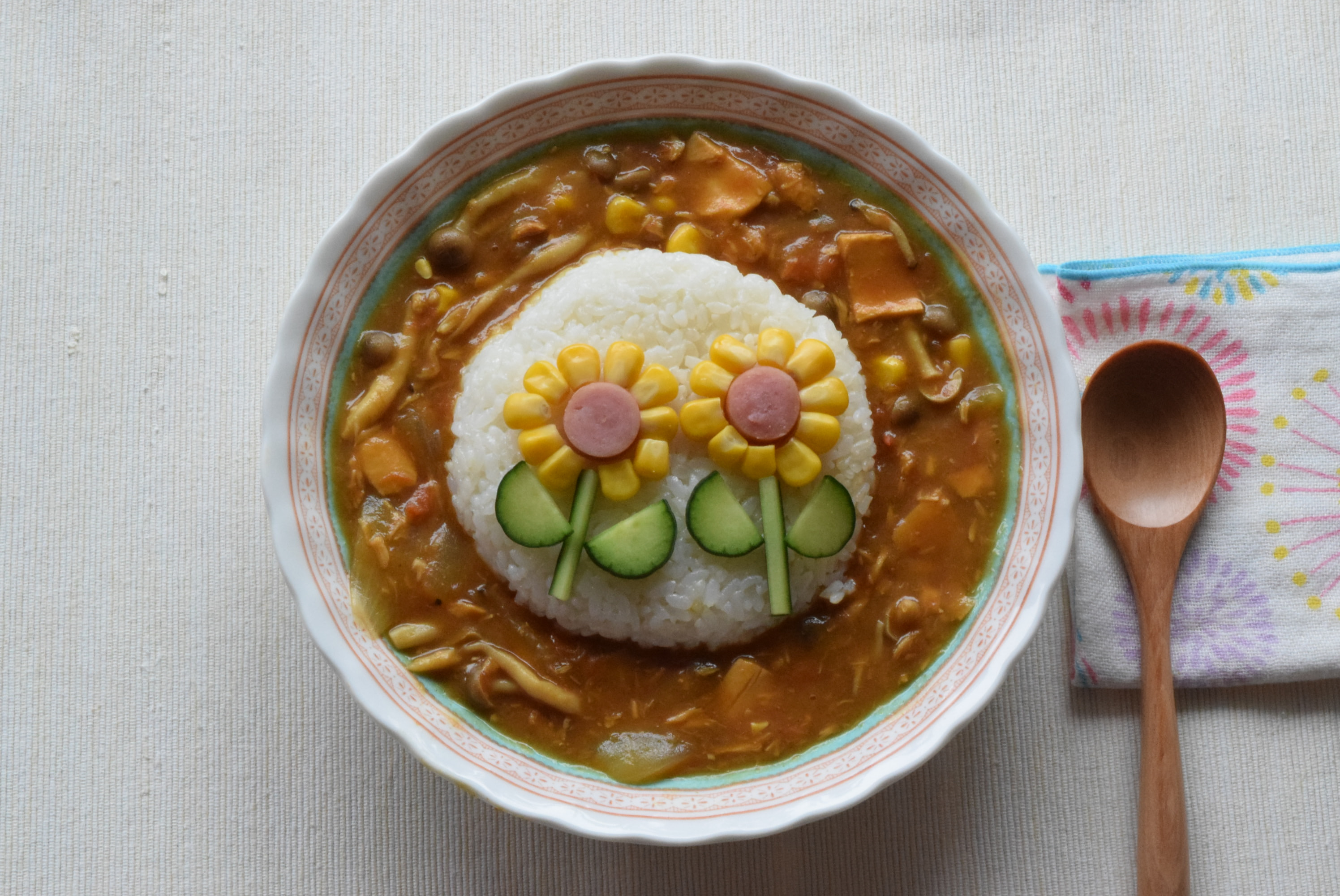 普段のカレーもお皿でお絵描きすれば、ほら、ひまわりカレーの出来上がり!味はもちろん作る工程も楽しめて、パパもママも子どもと一緒に笑顔の花咲くカレーです!