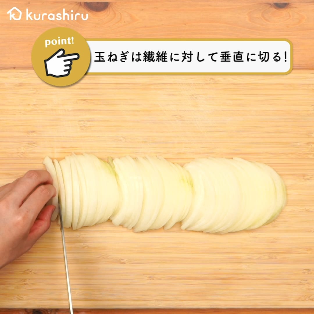 繊維に直角に切ることで、細胞が壊れてやわらかい食感になり、短時間で火が通ります。