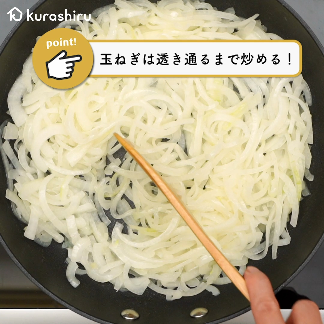 2.ハヤシライスソースを作ります。中火で熱したフライパンにサラダ油をひき、1の玉ねぎを5分程炒めます。