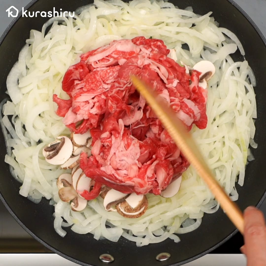 3.玉ねぎが透き通ってしんなりとしてきたら、1のブラウンマッシュルームと牛こま切れ肉を加えて、中火のまま炒め合わせます。