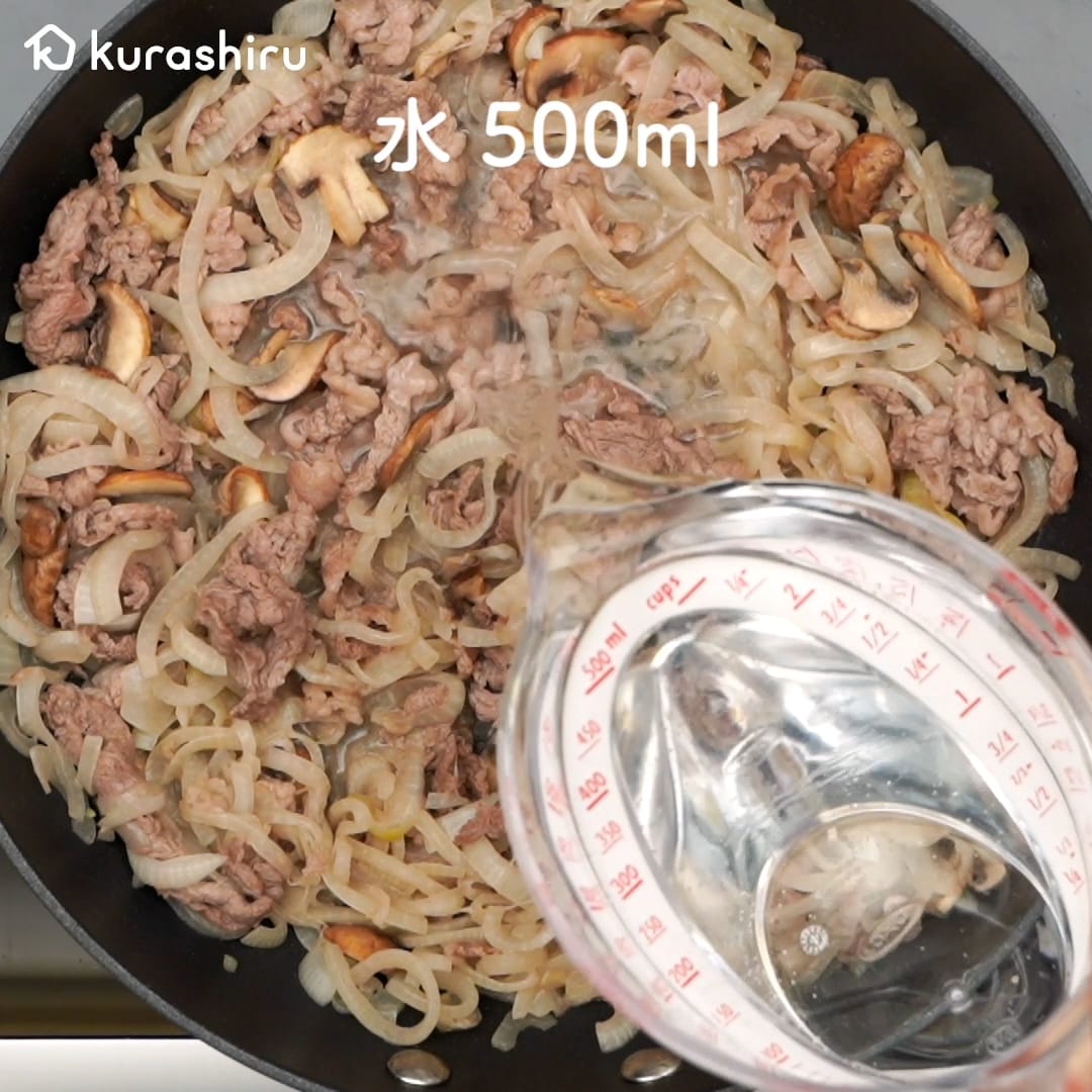 4.牛こま切れ肉の色が変わってきたら水を加えて中火のまま加熱します。沸騰したらあくを取り、弱火で5分程煮込みます。