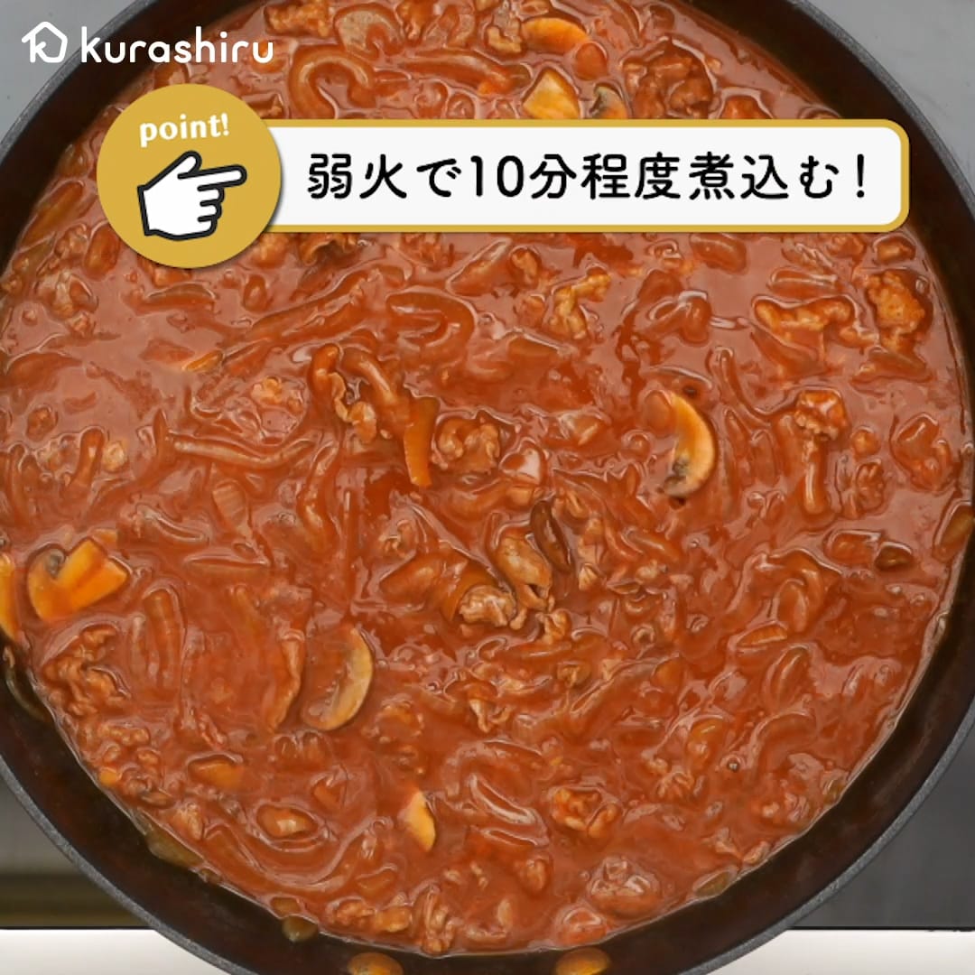 5.一度火を止め、「ハウス 完熟トマトのハヤシライスソース」を割り入れ、溶かします。再度弱火で加熱し、かき混ぜながら10分程とろみが付くまで煮込み、火から下ろします。
