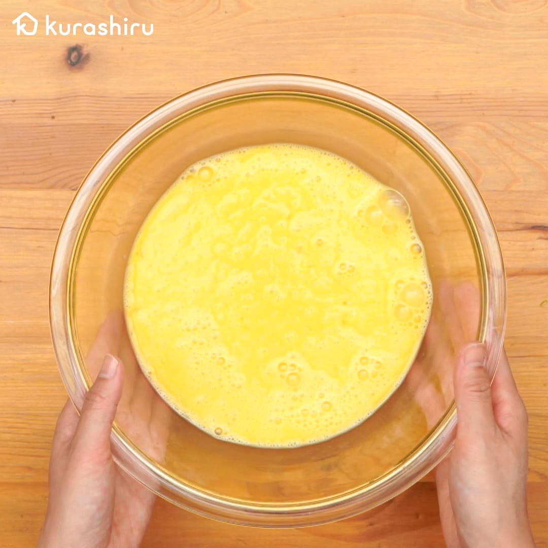 6.スクランブルエッグを作ります。ボウルに卵を割り入れて卵白を切るようにフォークで混ぜ合わせ、牛乳を加えて更に混ぜ合わせます。