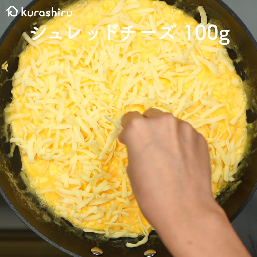 7.強火で熱した別のフライパンにサラダ油をひき、6を流し入れます。外側から内側にかき混ぜ、半熟状になったら、弱火にしシュレッドチーズを加えて混ぜ合わせます。チーズが溶けたら火から下ろします。