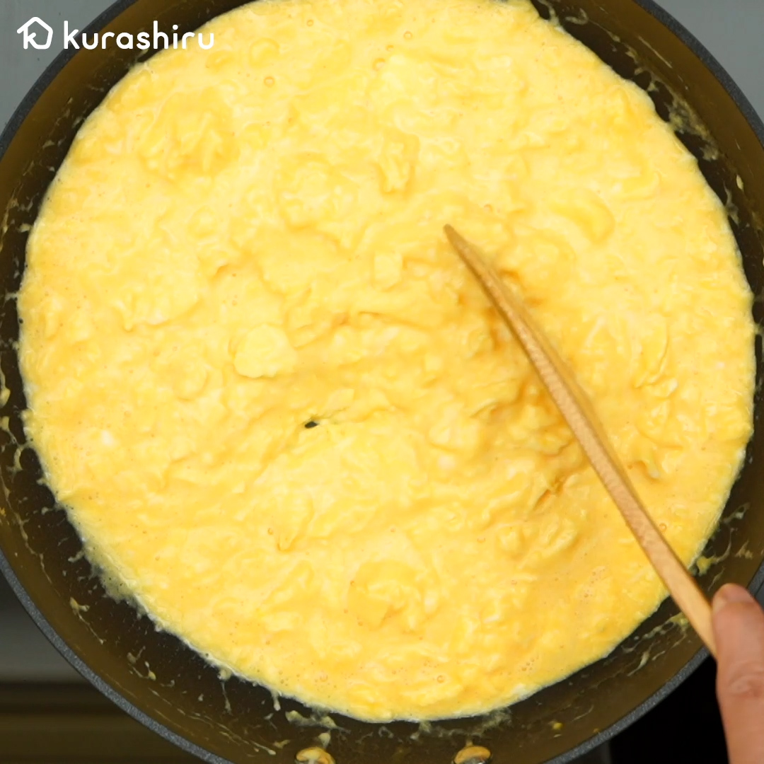 2.スクランブルエッグには、牛乳とピザ用チーズを加えることで、とろとろでリッチな仕上がりに