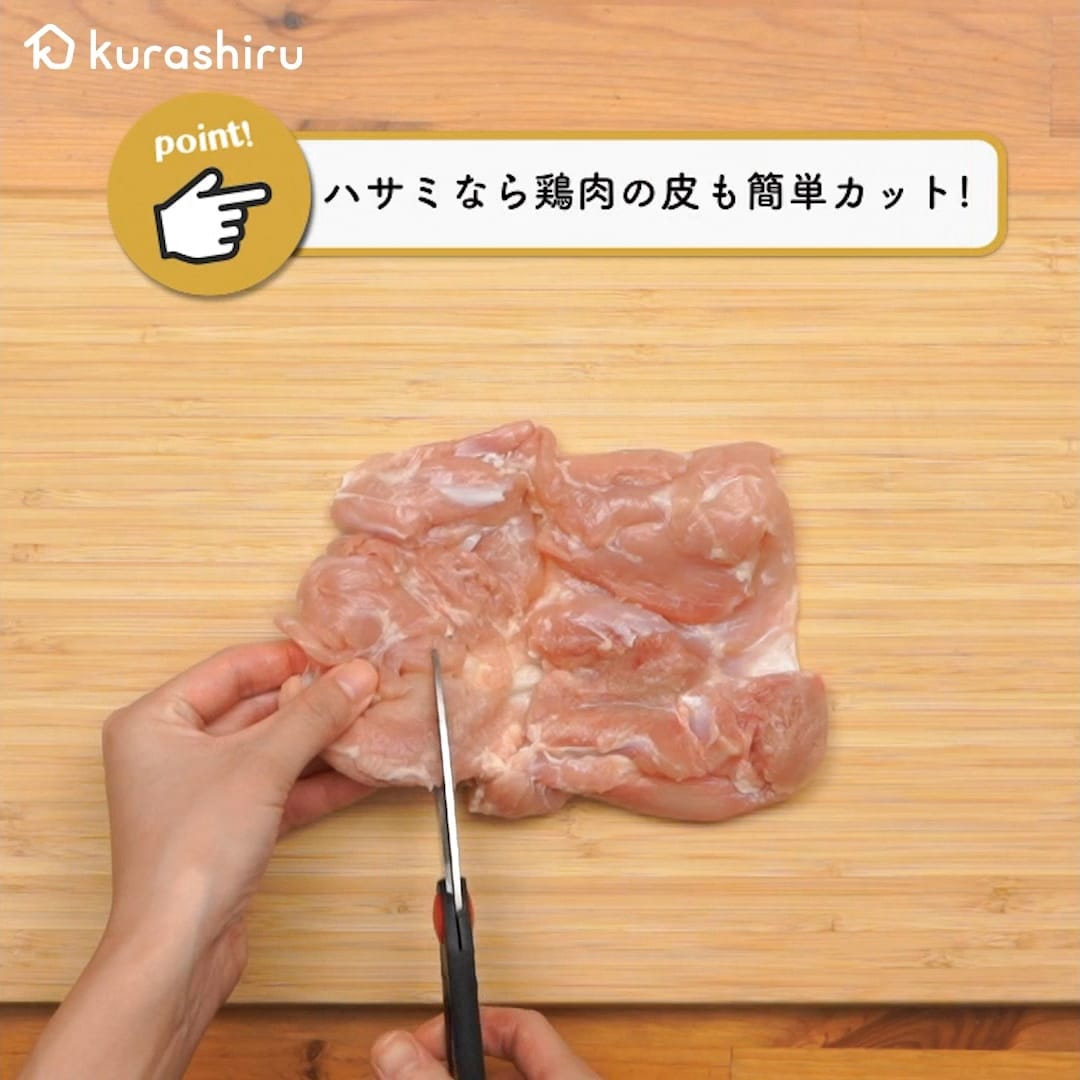 1.切りづらい鶏もも肉は、包丁ではなくキッチンバサミでカット