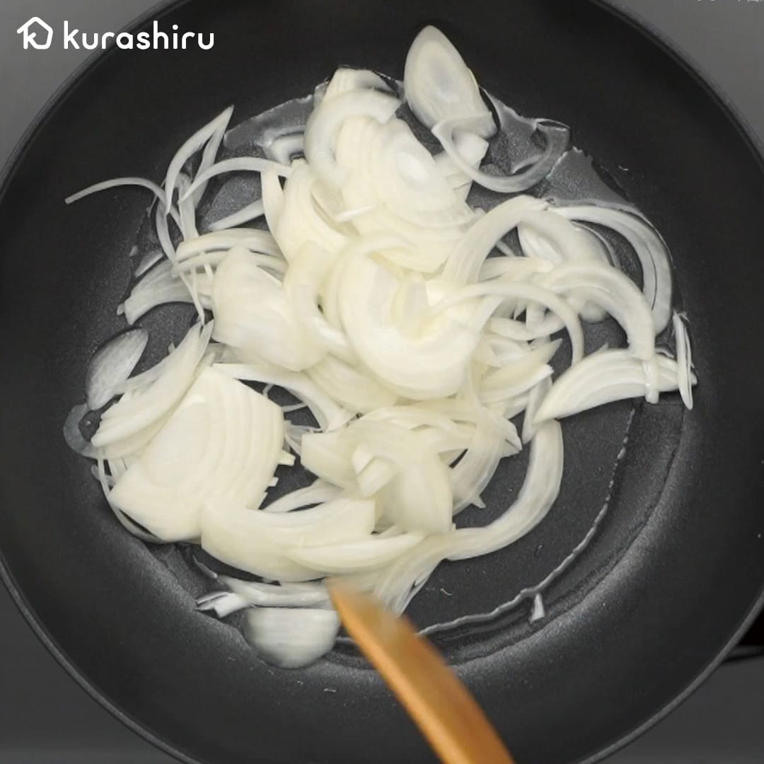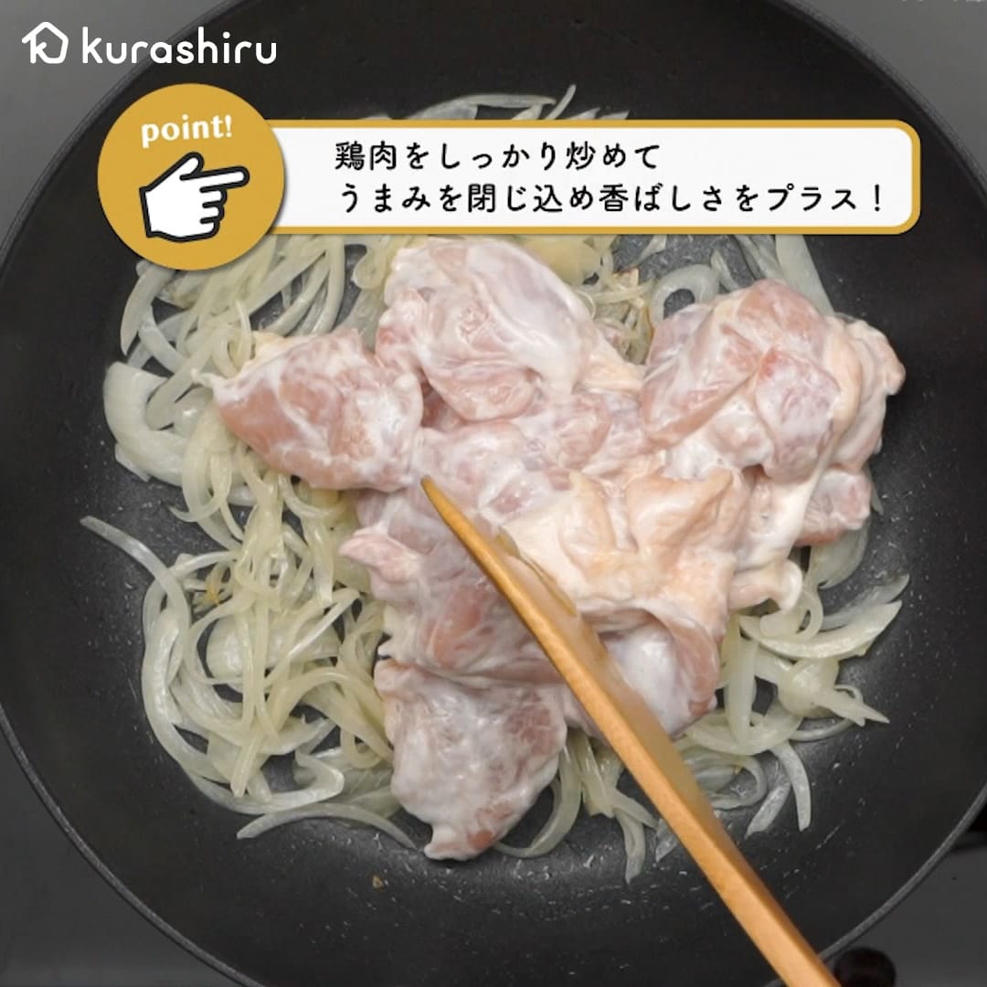 3.中火で熱したフライパンにサラダ油をひき、2を入れてしんなりするまで約4分炒めます。1を加えて、鶏もも肉の色が変わるまで炒めます。