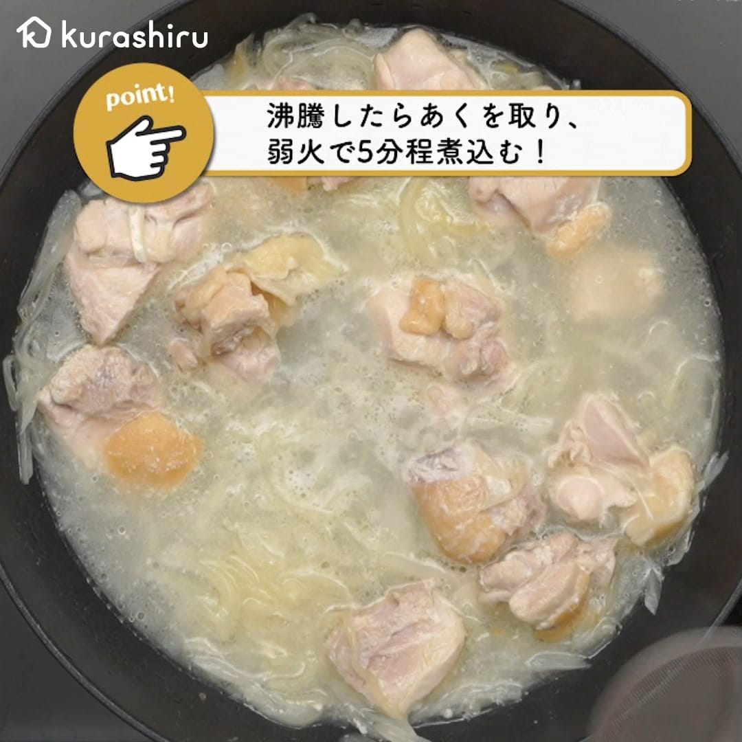 4.水を加えて中火のまま加熱し、沸騰したらあくを取り、時々かき混ぜながら弱火で約5分煮込みます。