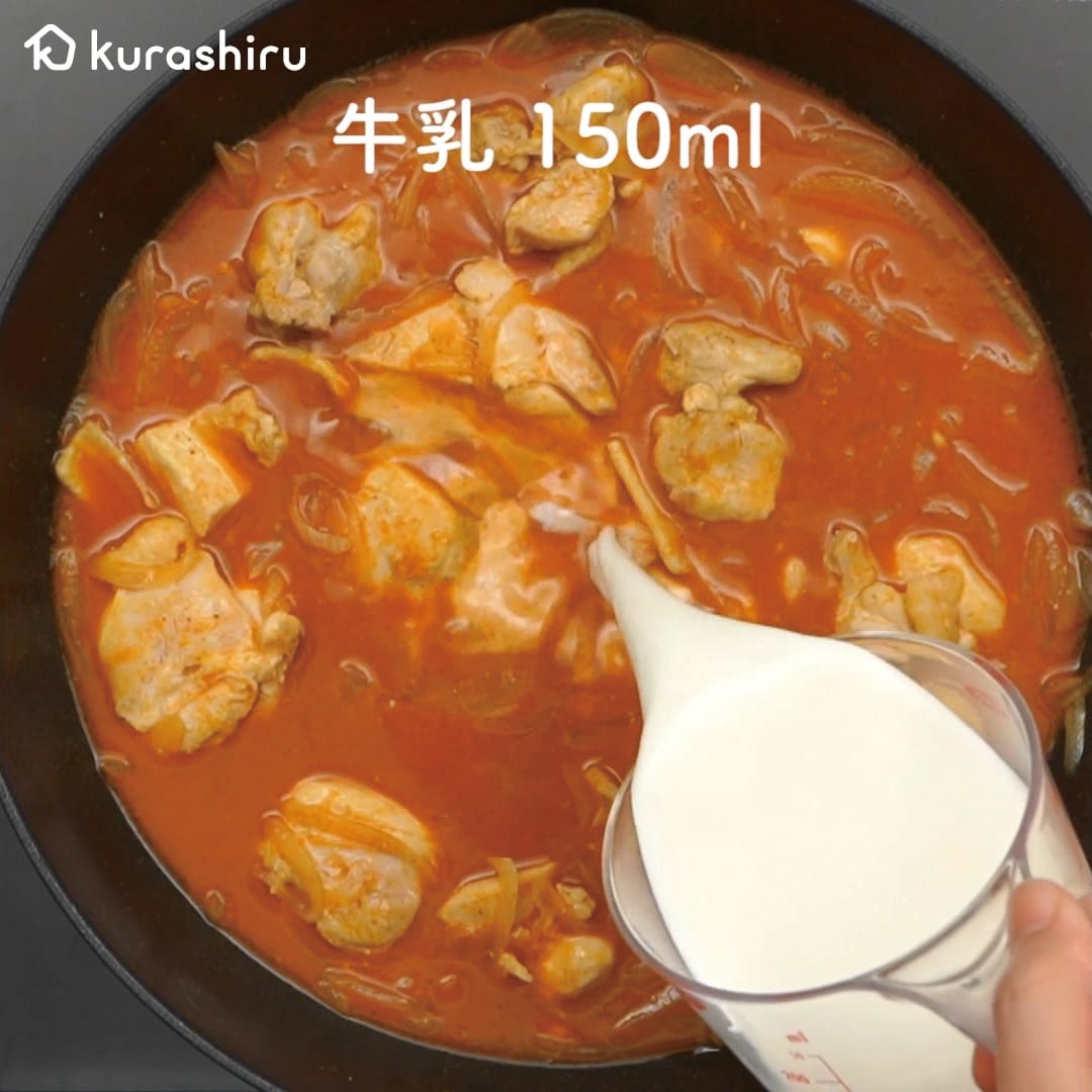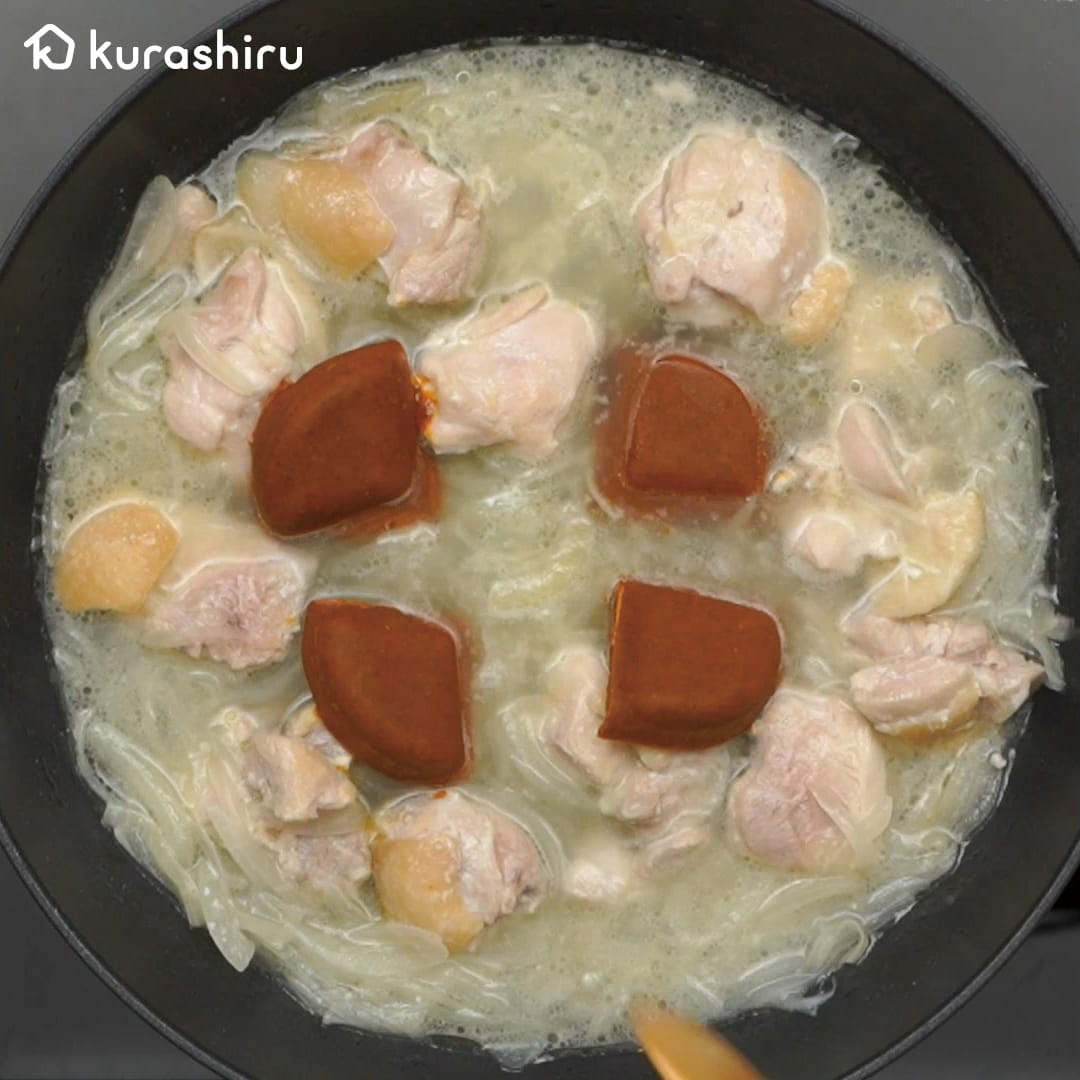 5.一旦火を止め、ルウを割り入れて溶かし、牛乳を入れてよくかき混ぜ、再び弱火で時々かき混ぜながら約5分煮込みます。