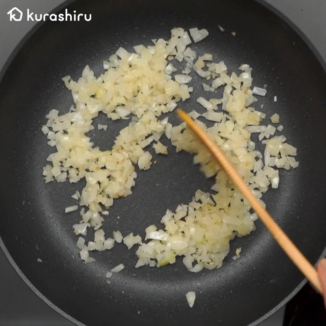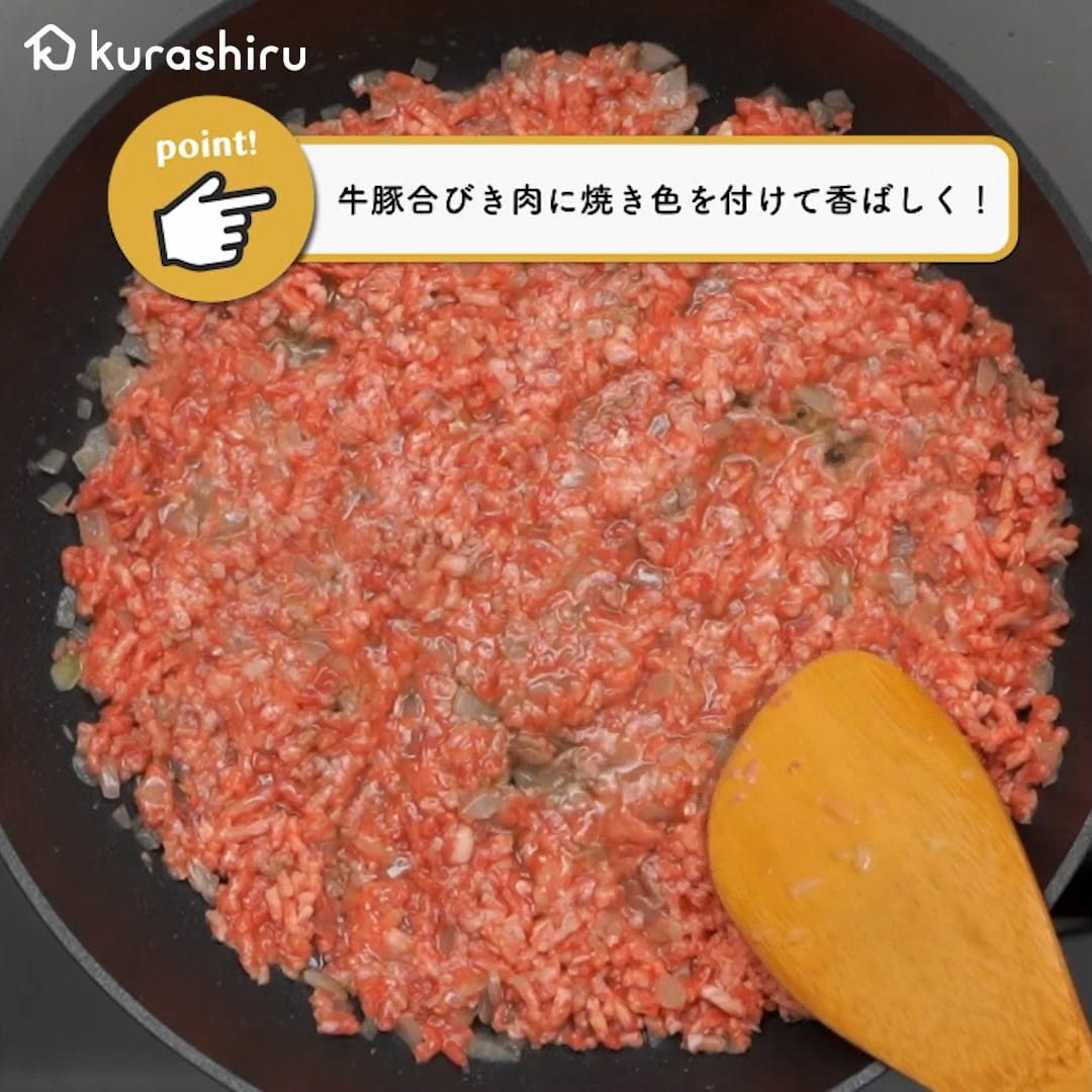 2.キーマカレーを作ります。中火で熱したフライパンにサラダ油をひき、1をしんなりするまで炒めます。牛豚合びき肉を加えて、押し付けるように全体に焼き色を付けます。