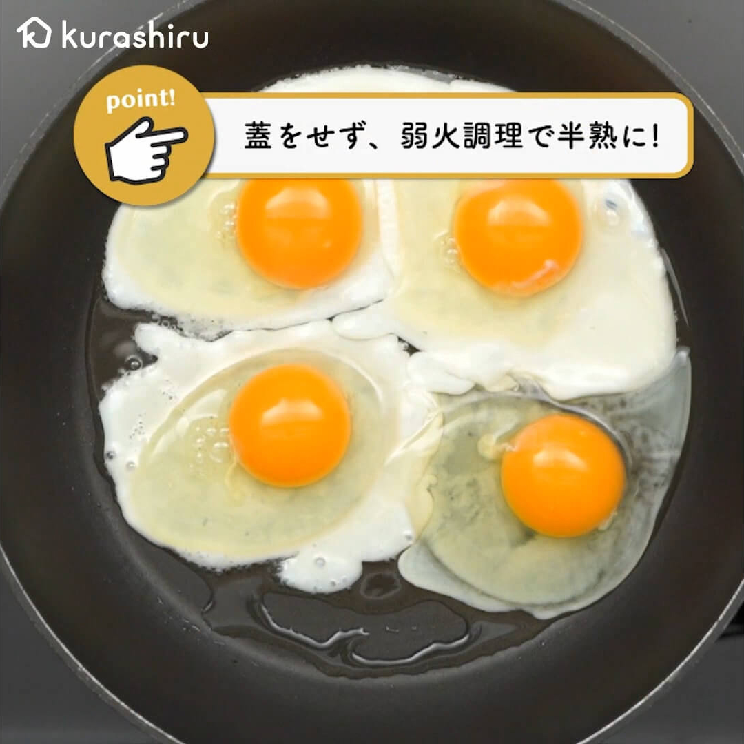 4.目玉焼きを作ります。別のフライパンを弱火で熱してサラダ油をひき、卵を割り入れます。白身が固まったら火から下ろします。