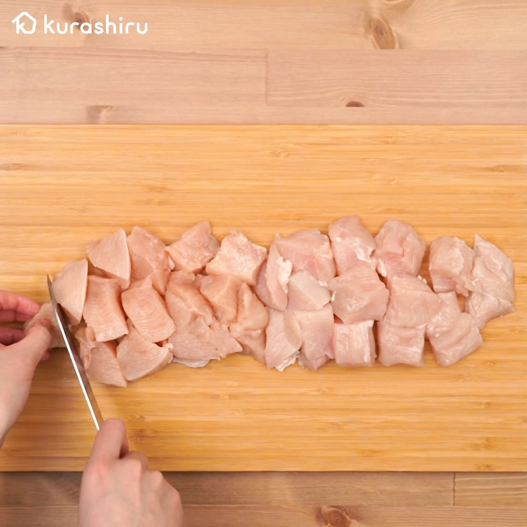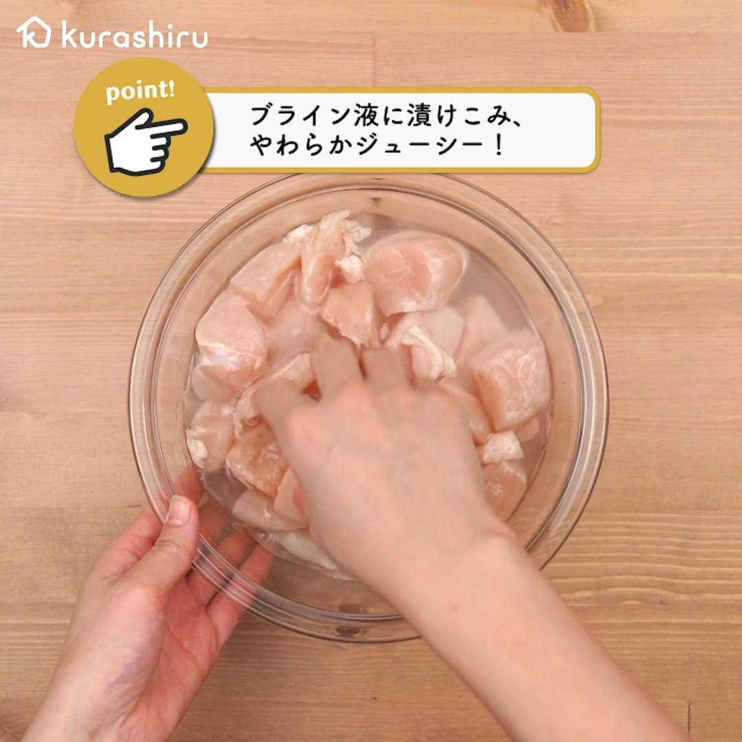 「ブライン液」と呼ばれる液体(水240ml/塩小さじ2/砂糖小さじ4)につけるだけで、鶏むね肉がやわらかくジューシーになりますよ!