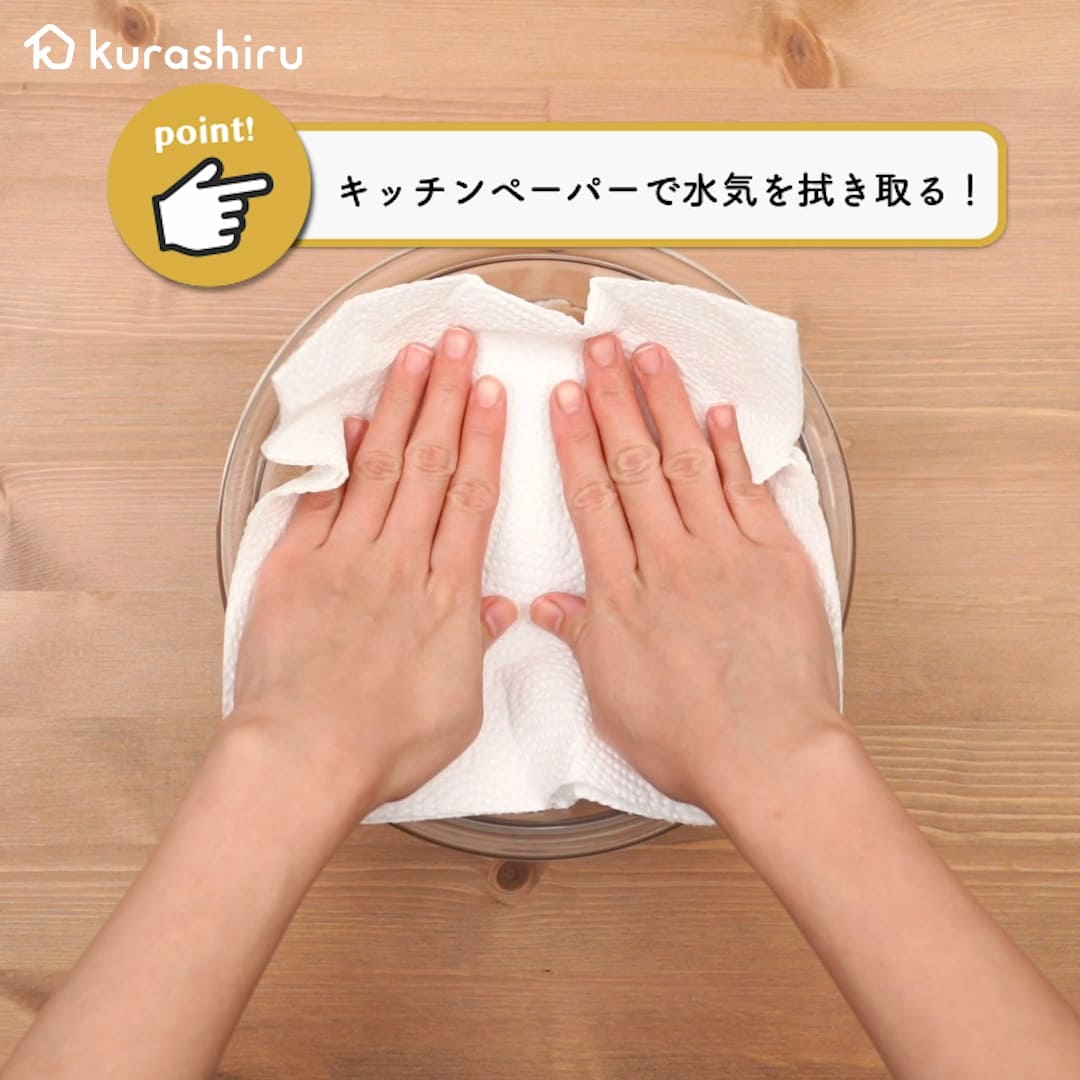 3.水気を切ったらキッチンペーパーで拭き、(A)を入れて全体になじむまで揉み込みます。