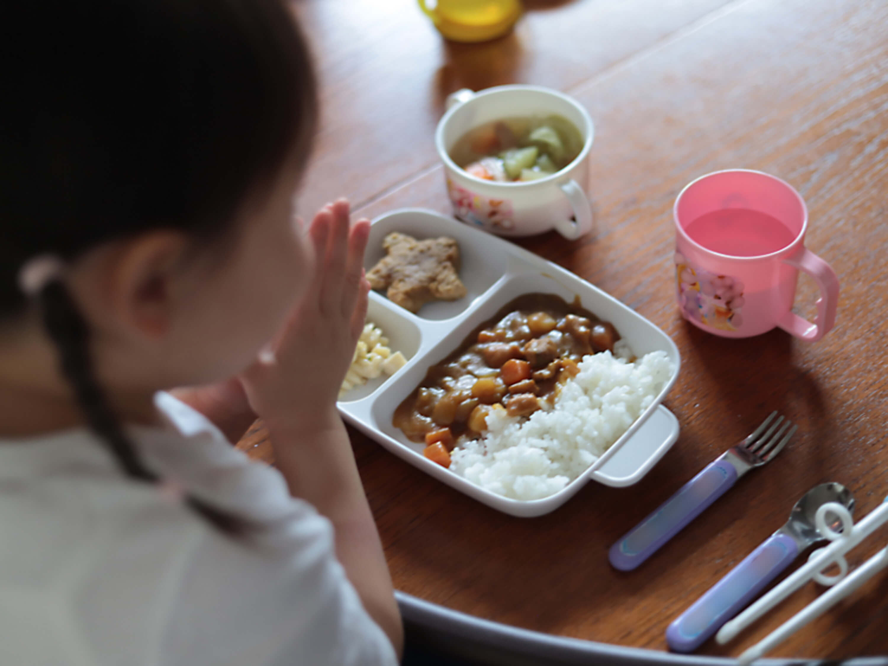 こばもえ:まず大きな声で「いただきます!」と言ってからごはんをスタートし、完食にはこだわらず、どんな味か?どんな食感か?何の野菜が入っているかな?など、食事の時間を大切にしたいと思っています。ただ、食わず嫌いはNG。「ひと口は挑戦しよう」を合言葉に、仕切りのあるお皿を使っておかずの中のどれかひとつを完食すればOKとしています。